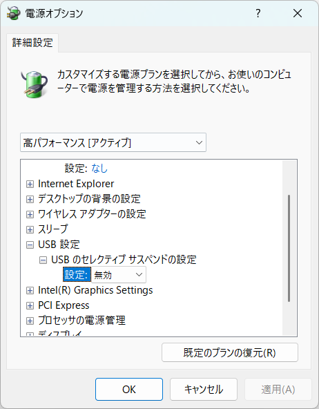 動画の通り、USBのセレクティブ サスペンドの設定をOFFにします。
