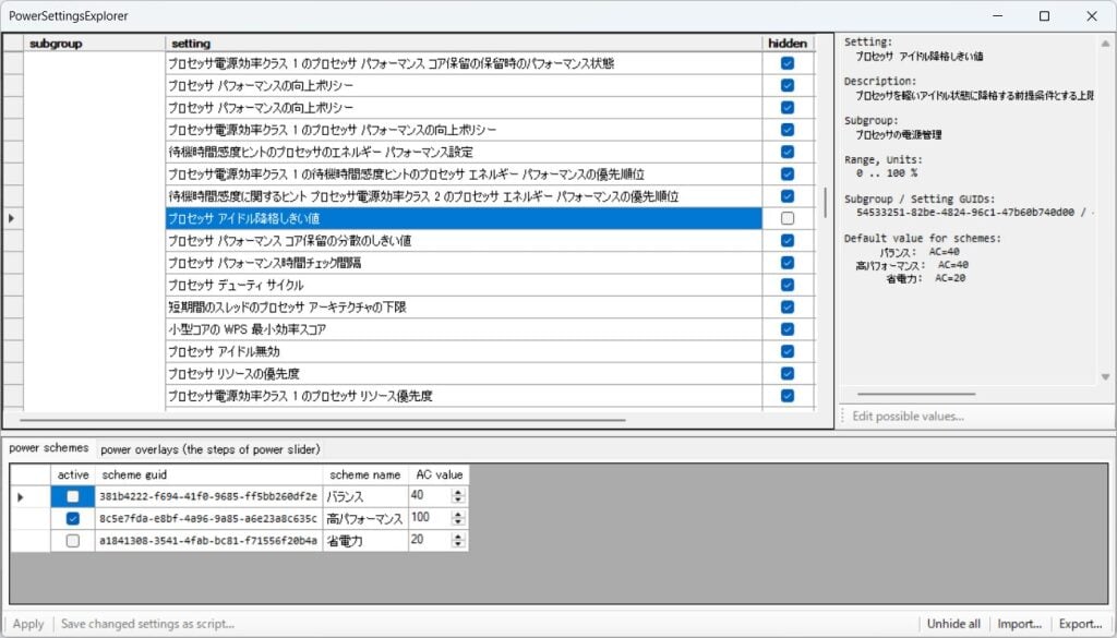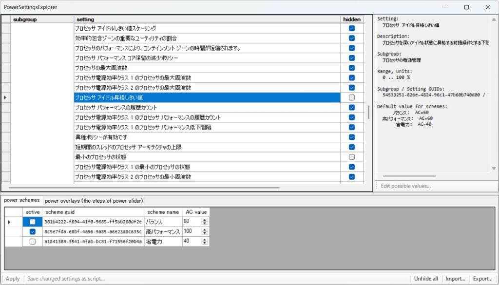 PowerSettingsExplorerを使ってCPUのアイドル閾値を変更する