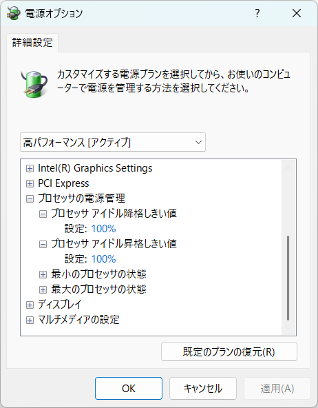 - プロセッサ最小/最大を 100% 固定(可能なら)