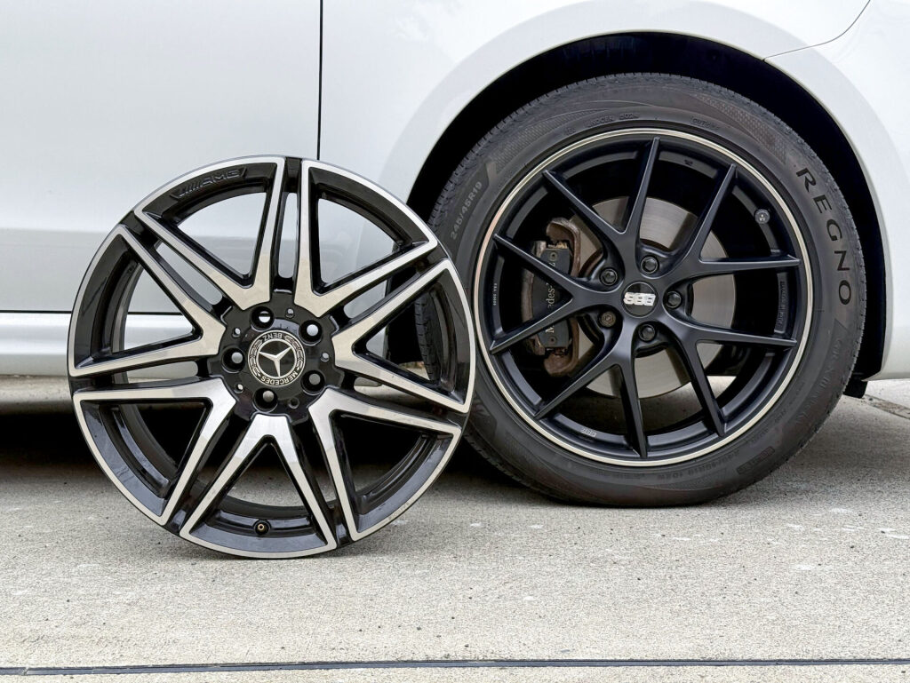 ただ、見た目は思いっきり変わります。特にVクラスはホイールの選択肢が少ないこともあって、ホイールを変えている方も少ないと思います。(そこまでこだわらない&純正ホイールも格好いい)