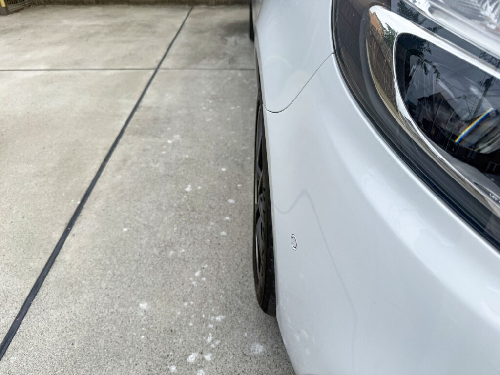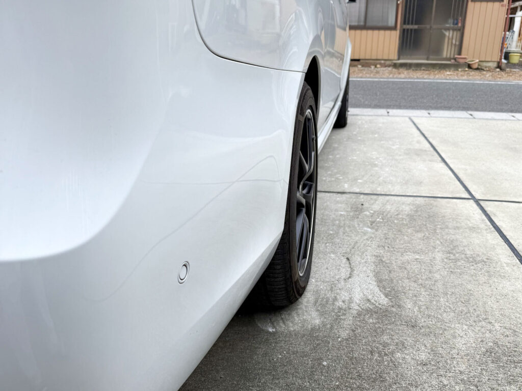 車がホワイトなので、ホイールはサテンブラックをチョイス。リムプロテクターがクローム仕上げでアクセントになっています。