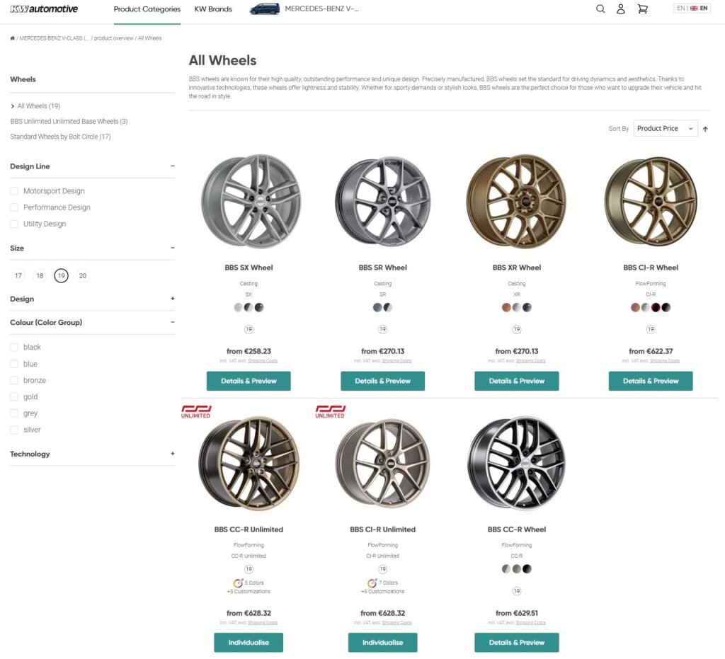 KW automotive社のサイトで、Vクラス(W447)の適合ホイールを検索した結果です。CC-Rも魅力的なデザインではありますが、やはりシンプルなCI-Rのデザインセンスの良さが光ります。